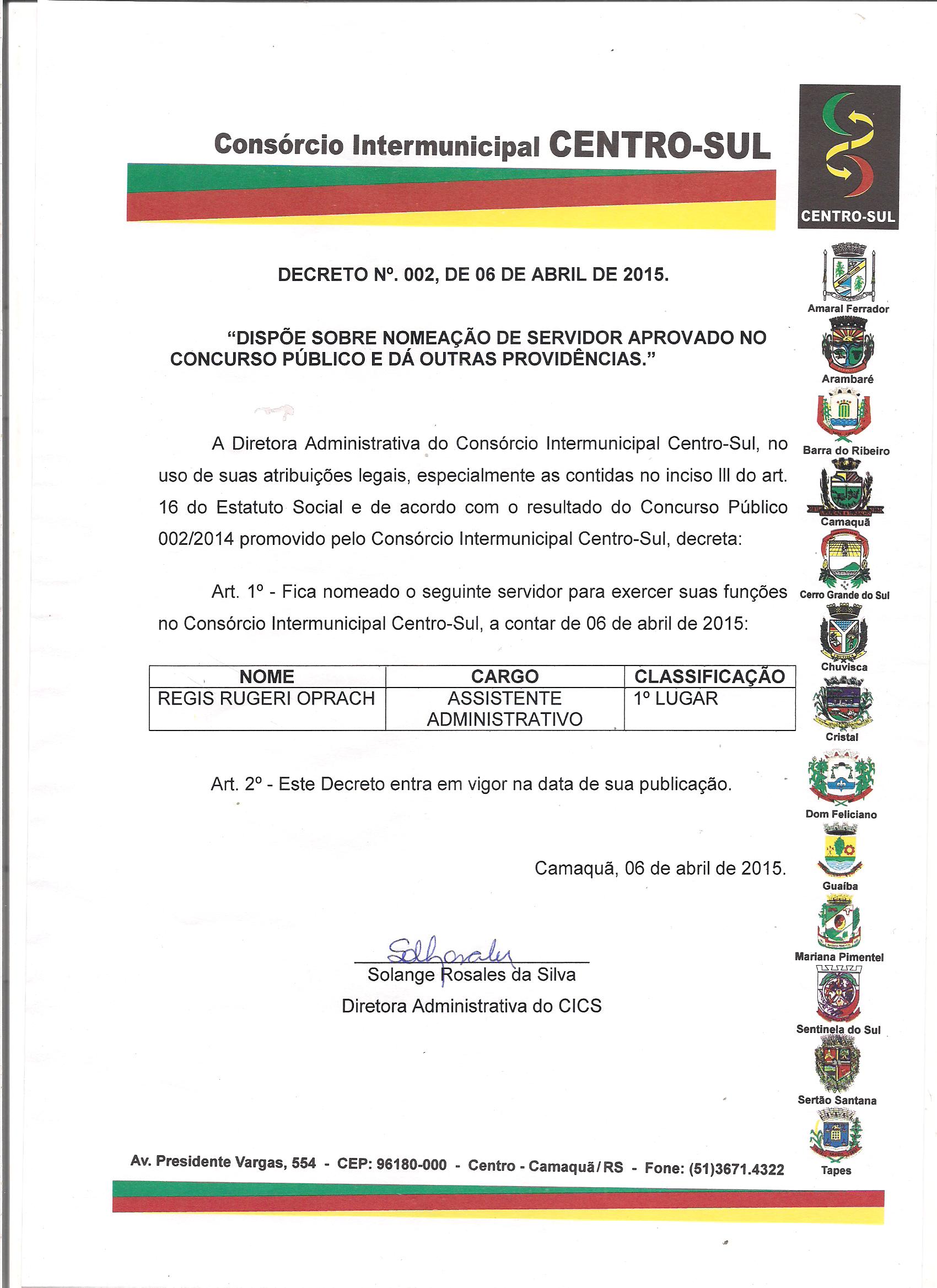 A Diretora Administrativa do Consórcio Intermunicipal Centro-Sul, no uso de suas atribuições legais, especialmente as contidas no inciso III do art. 16 do Estatuto Social e de acordo com o resultado do Concurso Público 002/2014 promovido pelo Consórcio Intermunicipal Centro-Sul.